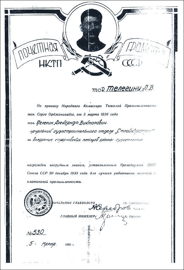 На почетной грамоте Народного комиссариата тяжелой промышленности много красной краски, портрет Сталина и рисунок серпа с молотом. На бланке напечатано, что по приказу наркома Георгия Орджоникидзе от 5 марта 1936 года начальник судостроительного отдела «Стройкрасмаша» Александр Викторович Телегин награжден значком стахановца золотой и платиновой промышленности за внедрение передовых методов в судостроение. Грамоту подписал начальник «Главзолота» Александр Серебровский.