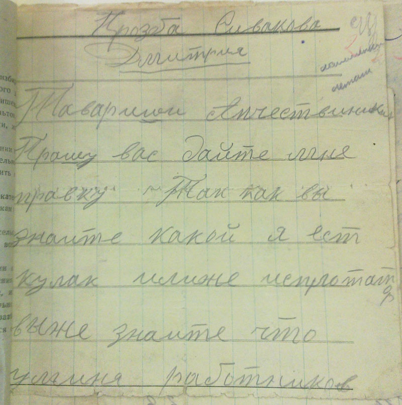 Из заявления: «Лишены голоса в 1931 году. Причиной лишения голоса, я заверяю вас, было мщение по личным счетам. Моего мужа в 1931 беспричинно арестовали и дели совершенно неизвестно куда, а сейчас я осталась на произвол судьбы с семейством в восемь человек, причем самому старшему 17 лет. В колхоз меня и моих детей как лишенную не принимают.