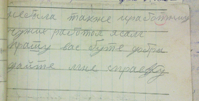 «Заевление в Абанскую милицию от канарайских бедняков. Мы заявляем вам что Б. М. кулачка спрятана сеялка влесу и нидает никому сеят паэтому просим вас ее взят чтобы ее работать. Еще заевляем что ее муж шлет письма чтобы она ехала кнему то она падмазалас ксел-совету сел-совет выдал дукумент батрачиский она хочит уехать еще заявляю вам чтобы вы абанский их и найдете ее мужа писма еще заевляем что М. (нрзб) 3 мишка пшаницы (нрзб) и распродала хлеб насторону».
