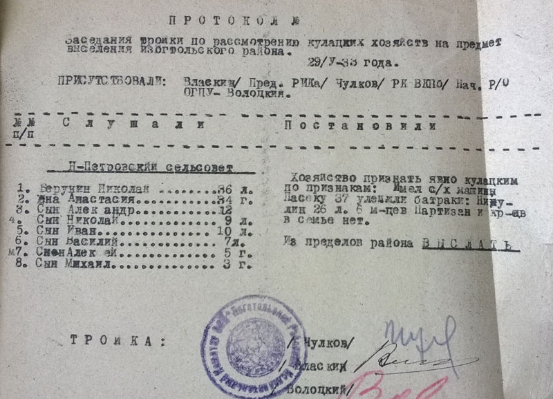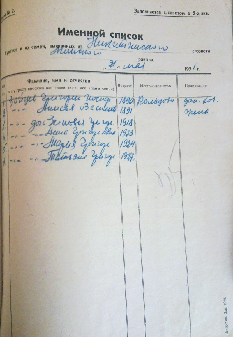 Именной список высланных кулаков. Архив г. Ачинска, ф. 295, оп. 1-с, д. 381, л.