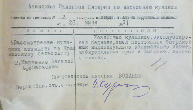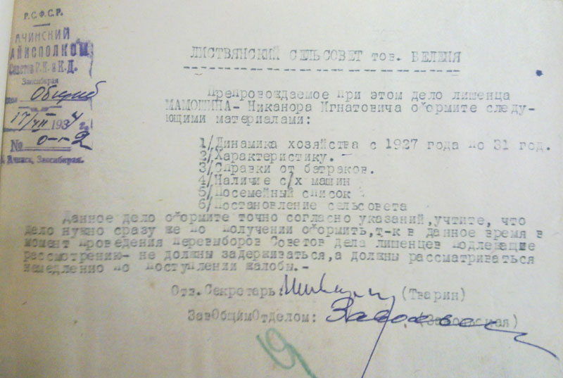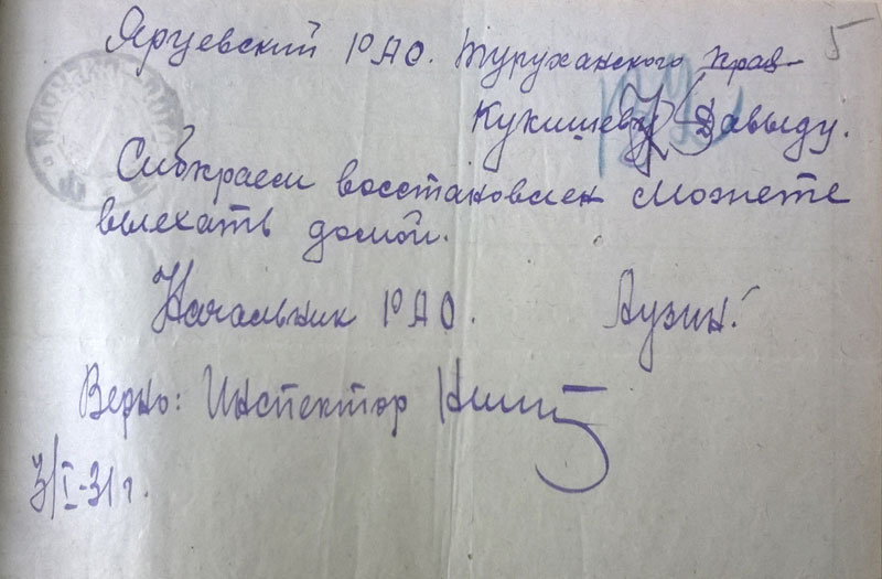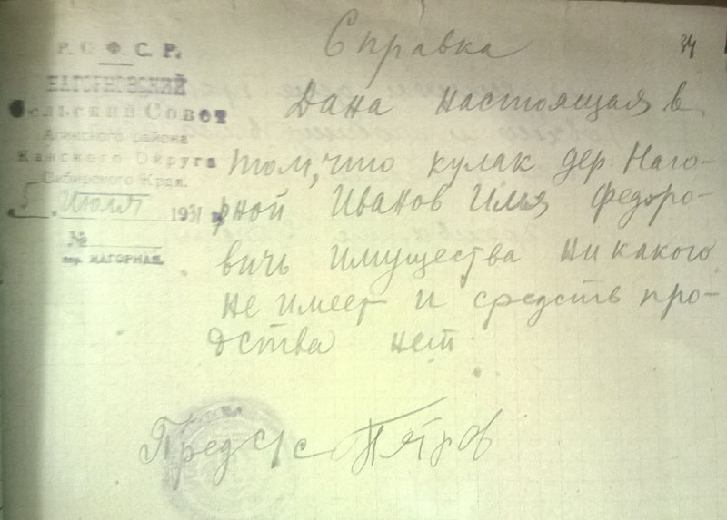 Разрешение высланному кулаку вернуться в село. Боготольский районный архив, ф.
