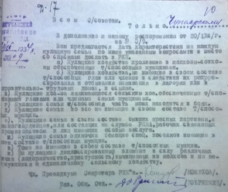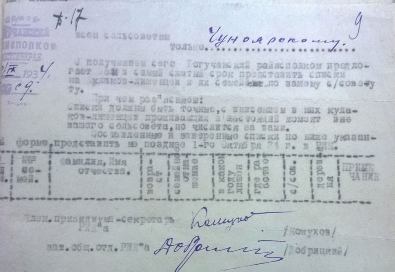 Циркуляр Богучанского райисполкома от 20.09.1934 г. ГАКК, ф. 1748, оп. 1, д. 2,