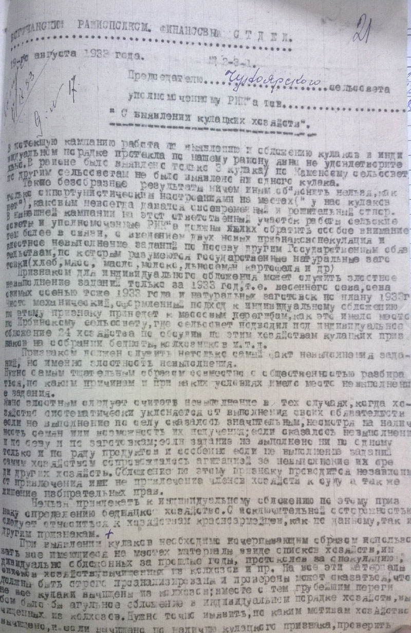 Циркуляр Богучанского райисполкома от 19.08.1933 г. ГАКК, ф. 1748, оп. 1, д. 1,