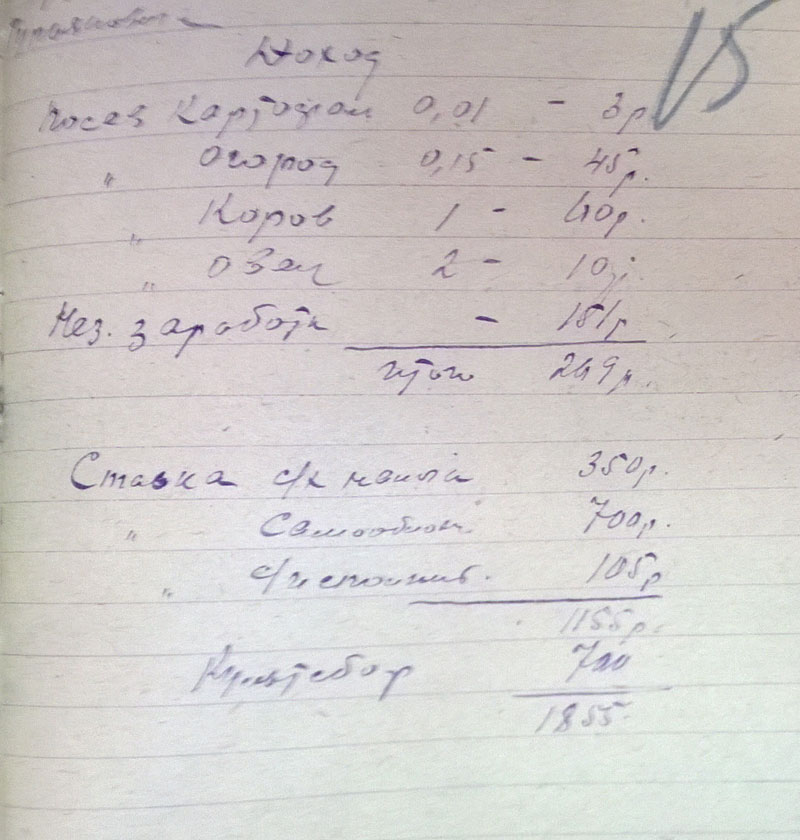 Итого: налог 1855 руб. при доходе 269 руб. ГАКК, ф. 1748, оп. 1, д. 210, л. 15