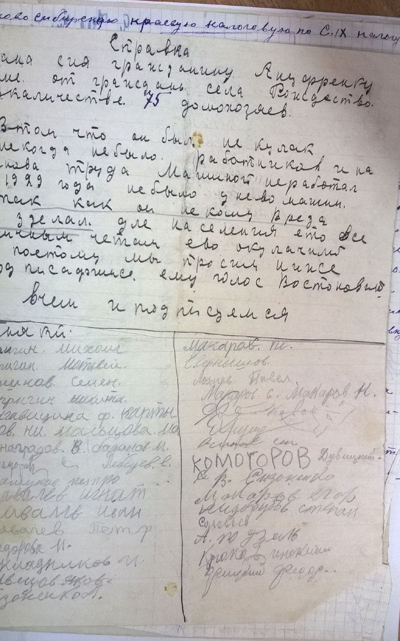 Присутствие в этих списках было попросту опасным, и крестьяне, как могли, сопротивлялись. Они писали жалобы в райисполком, или во ВЦИК, или в прокуратуру, доказывая, что их лишили избирательных прав неправильно. В значительной степени личные дела лишенцев состоят именно из этой переписки. К жалобе нередко прикладывали «письма одобрения», подписанные десятками односельчан, которые ручались за просителя. Примеры таких писем приводились в томе 12 Книги памяти. Такие письма встречаются в делах очень часто, они подписаны не только середняками, но я бедняками и батраками, что опровергает тезис о том, что беднота была за то, чтобы репрессировать зажиточных крестьян.