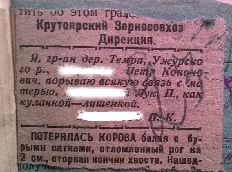 Все это, конечно, вызывало разрушение семейных отношений. Дети отказывались от родителей, в том числе публично, через газету. Примеры таких заявлений даны в документах ниже.
