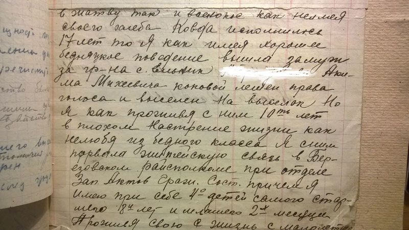 В документе, приведенном ниже, замечательна не только фактология, но и язык — совершенно платоновский: «я прожила с ним 10ть лет в плохом настроении жизни как не любя из бедного класса. Я с ним порвала житейскую связь в Березовском райисполкоме при отделе Зап. Актов Граж. Сост.»