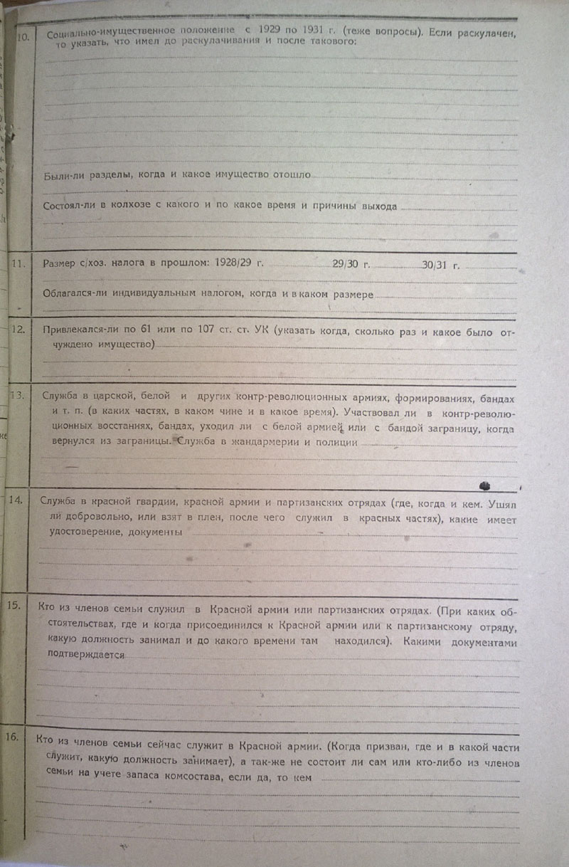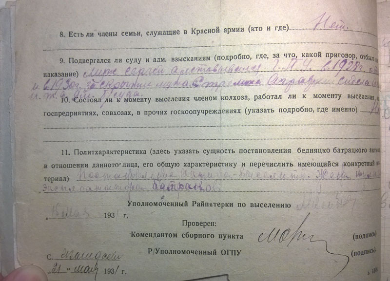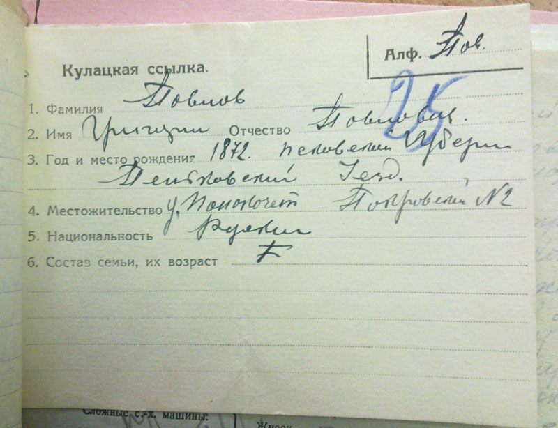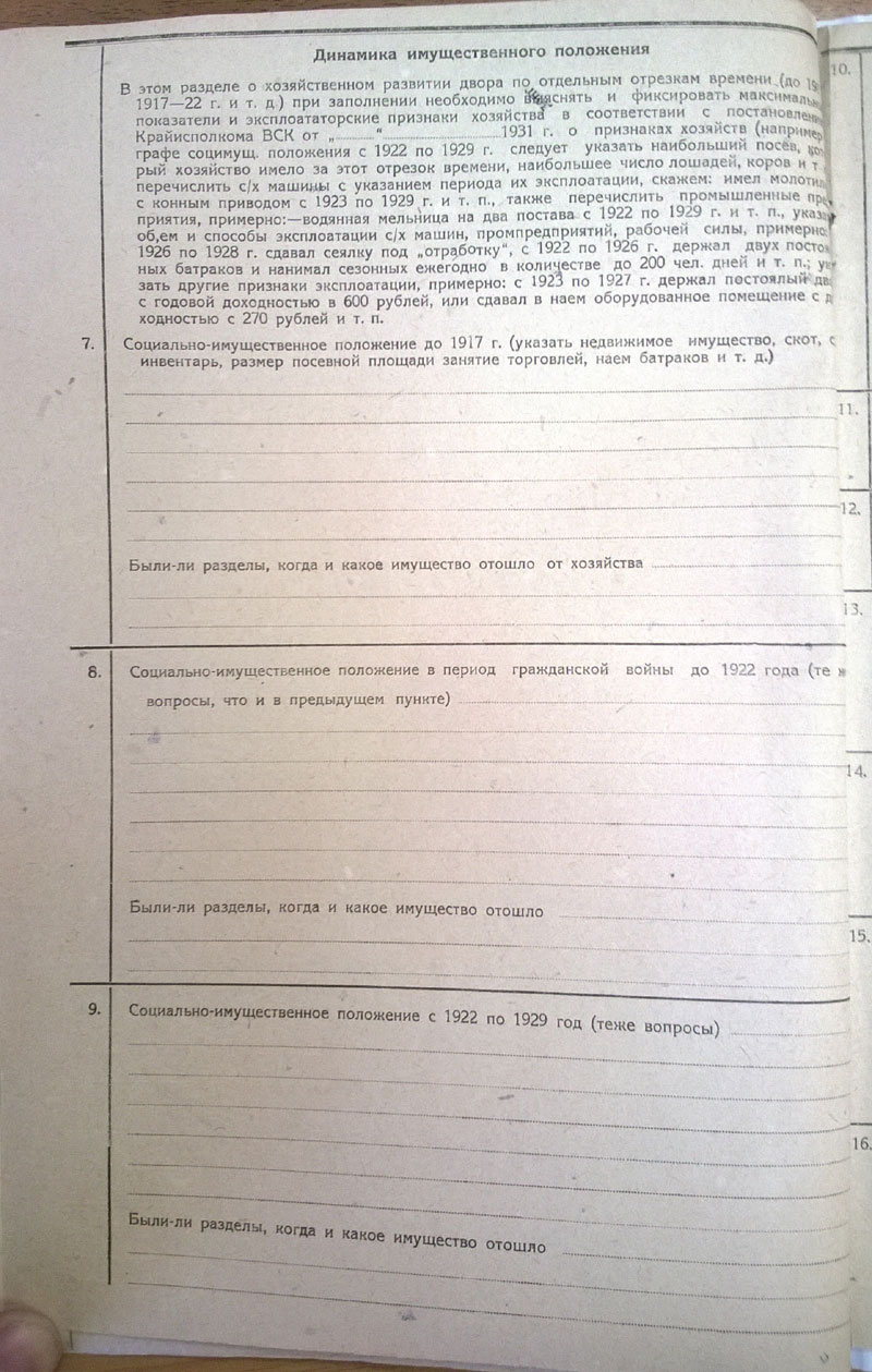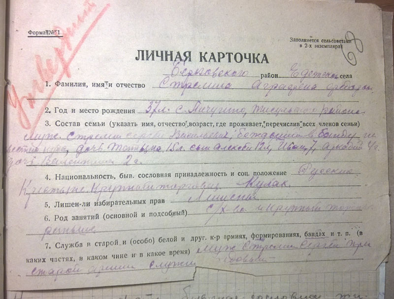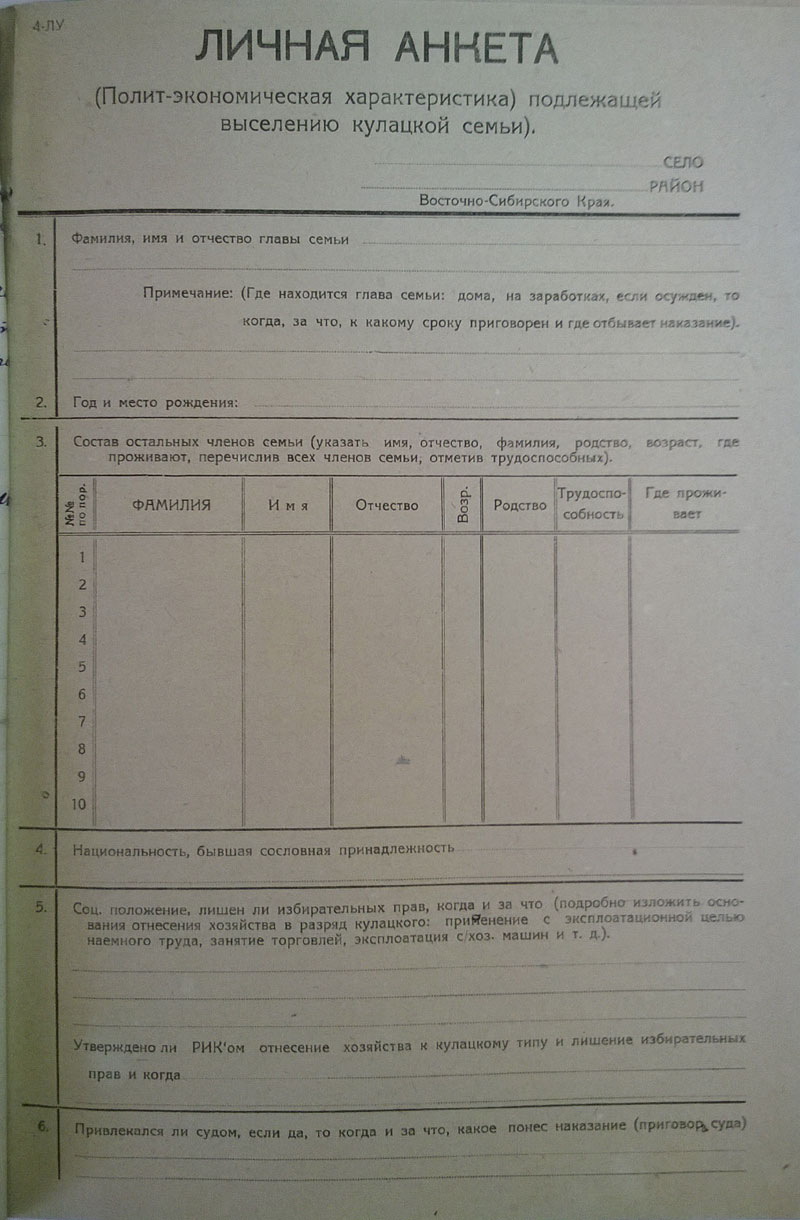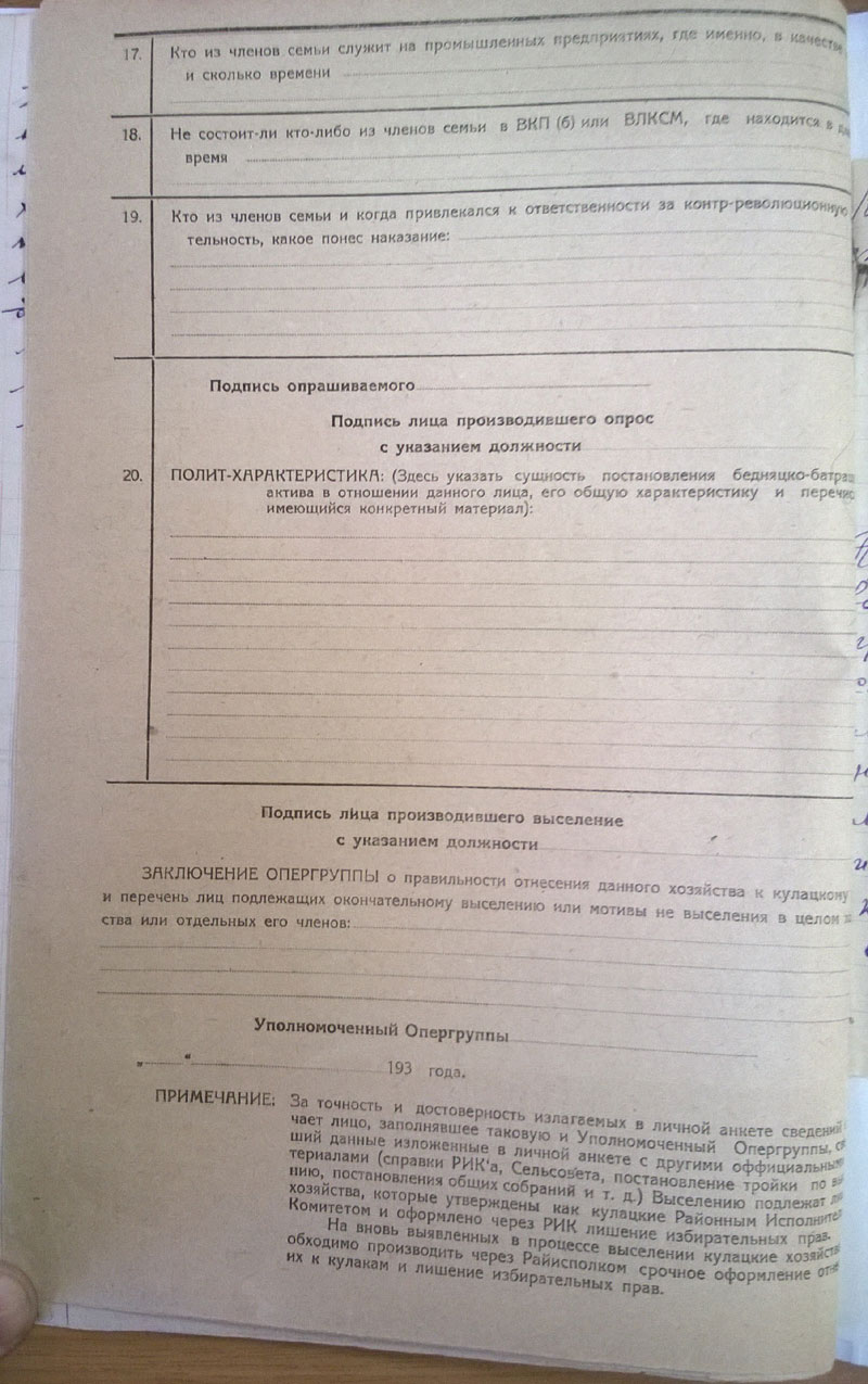 а) Немедленно по приезде в деревню Уполномоченный Опергруппы производит изъятие глав семьи и заполнение личной анкеты (социально-экономической характеристики) путем личного опроса главы кулацкой семьи или его заменяющего, но ввиду того, что кулаки обязательно будут скрывать данные об экономике своего хозяйства и признаках эксплоатации, Уполномоченный имеет перед собой личное дело данного кулацкого хозяйства и, кроме того, приглашает Председателя местного Сельсовета и актив, хорошо знающий данного кулака. Анкеты заполняются со всей внимательностью, без всяких умолчаний на анкетные вопросы, а сведения, реабилитирующие кулаков, проверяются внимательным образом.