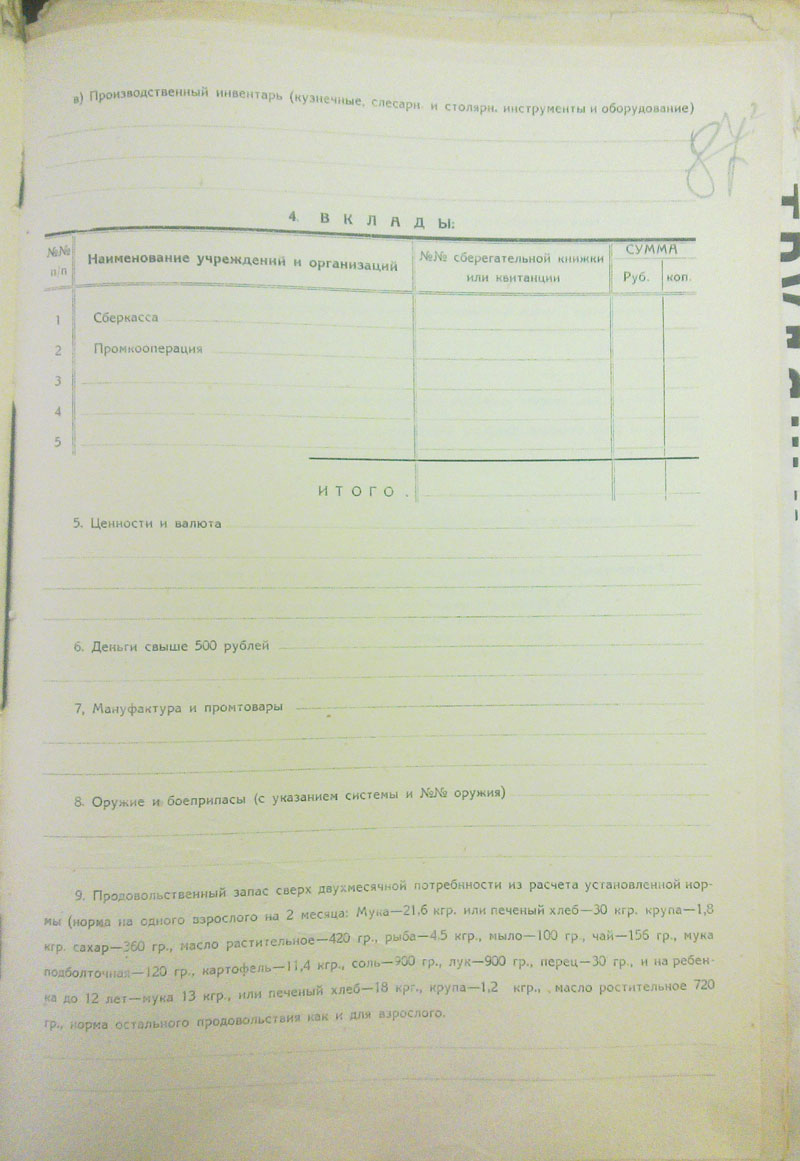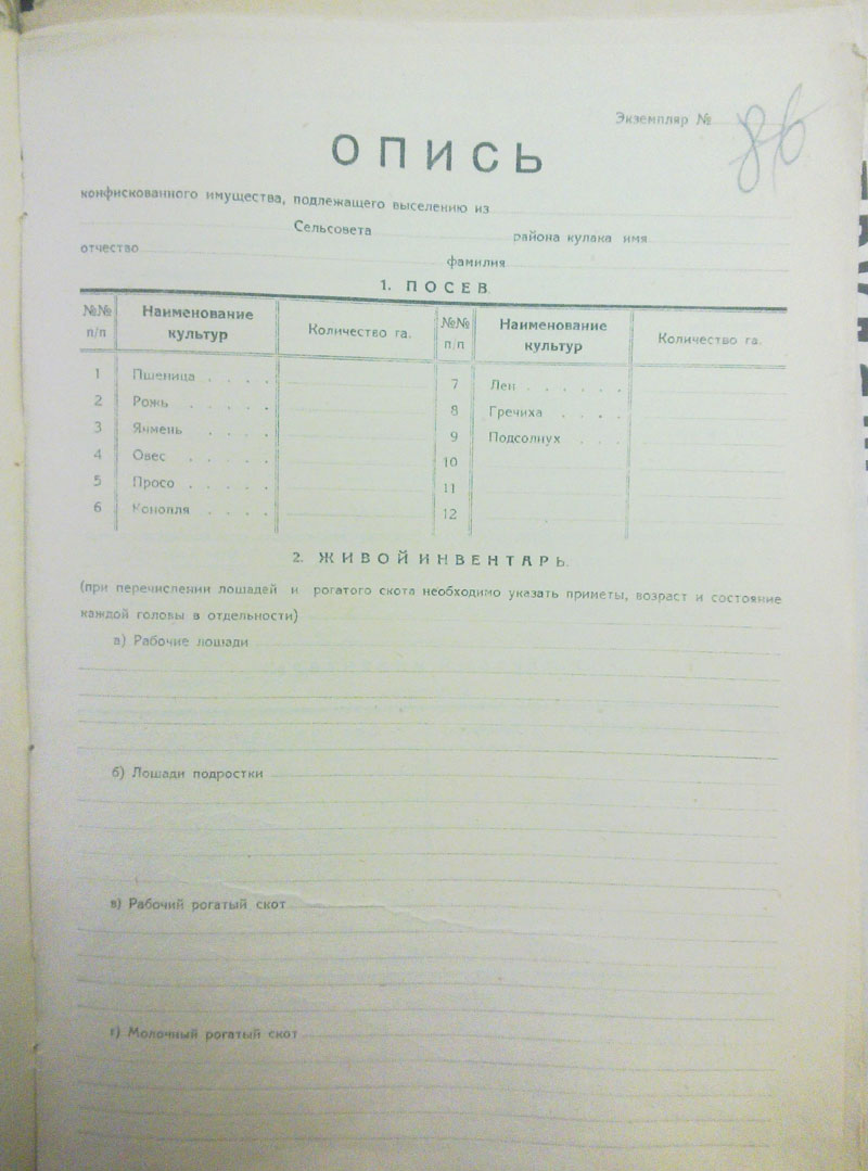 Конфискация имущества каждой кулацкой семьи оформляется составлением подробной описи по форме, Вам посланной в 4-х экземплярах, из коих 1 направляется в Районную Тройку, второй — передается в местный Сельсовет вместе с конфискованным имуществом, третий — приобщается к делу выселяемой семьи и четвертый вручается главе раскулаченной семьи.
