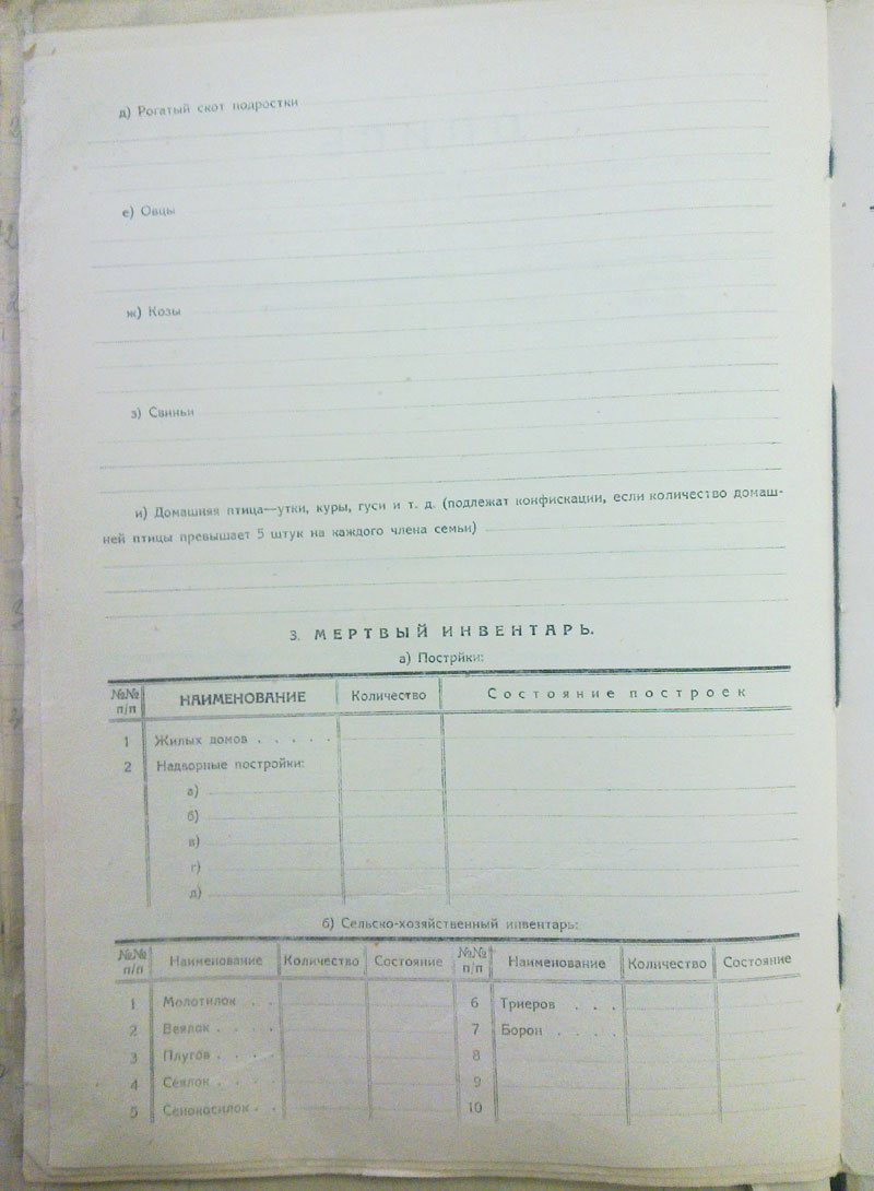 б) По выяснению на месте потребности колхозов и утвержденных Райтройкой заявок колхозов им передается конфискованное имущество с составлением подробной описи с указанием оценки, фамилии бывшего владельца имущества. Опись составляется в 3-х экземплярах: один направляется Райтройке, второй остается в местном Сельсовете и третий — в колхозе, принявшем имущество.