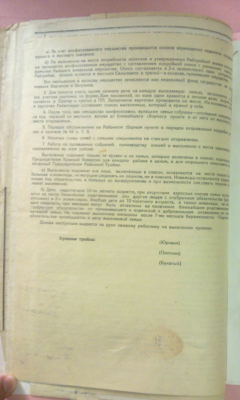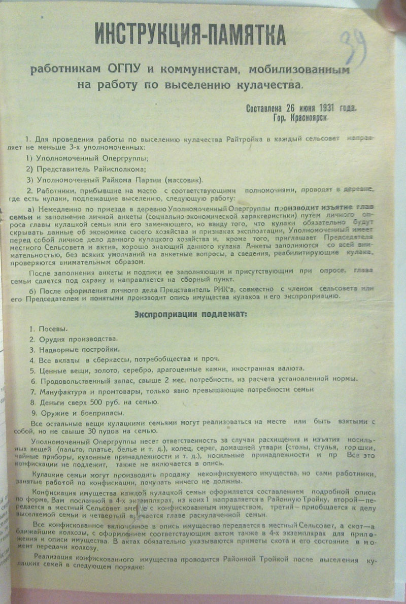 Данная инструкция выдается на руки каждому работнику по выселению кулаков.