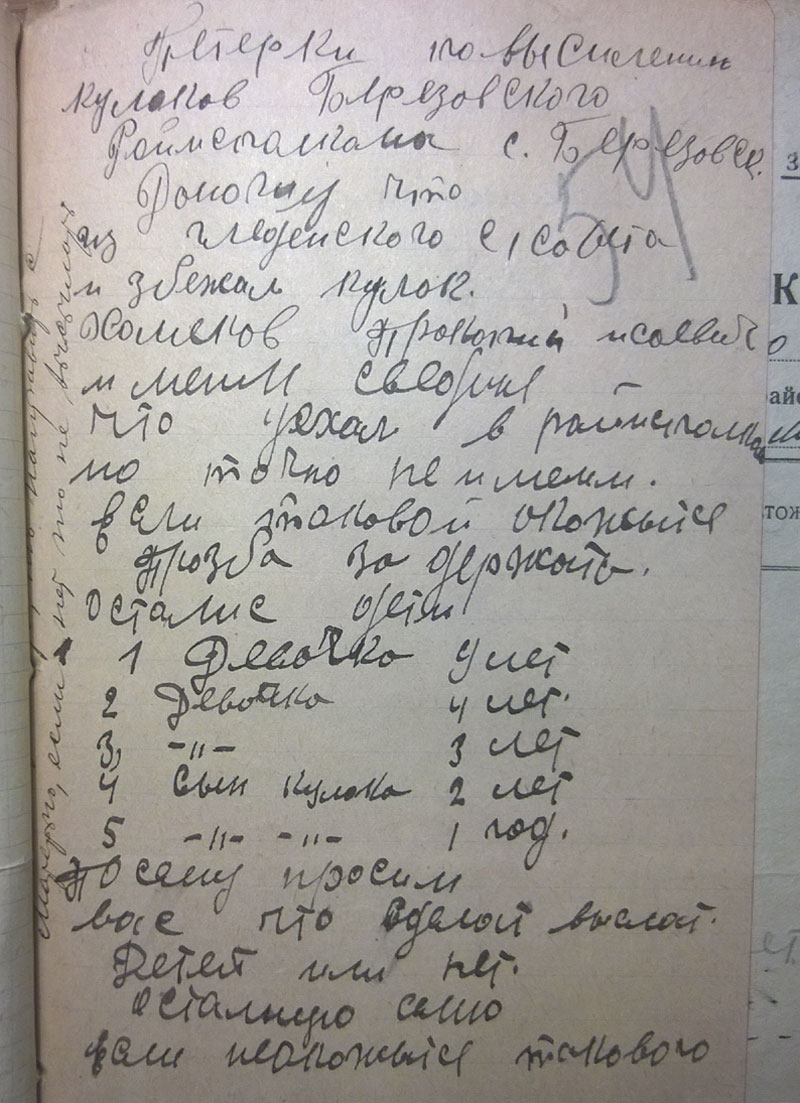 б) Дети, не достигшие 10-ти летнего возраста, при отсутствии взрослых членов семьи, остаются на месте ближайшим родственникам или другим лицам с отобранием обязательства (форма отослана) в 2-х экземплярах. Вообще дети до 10-летнего возраста, а также инвалиды, не могущие следовать, при желании могут быть оставлены на попечение ближайшим родственникам с отобранием обязательства от принимающего и под подпиской о добровольном оставлении от кулацкой семьи. Не подлежат выселению женщины после 7-ми месяцев беременности. Подписанные обязательства приобщаются к делу выселяемой семьи.