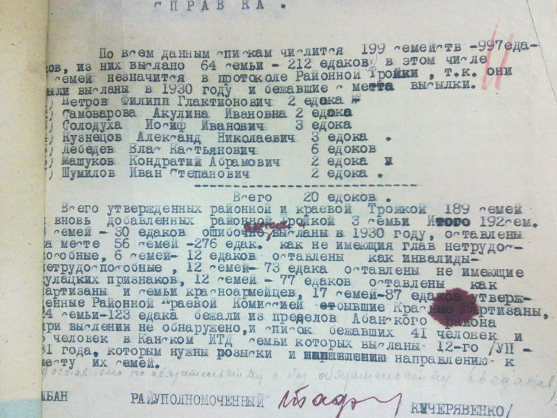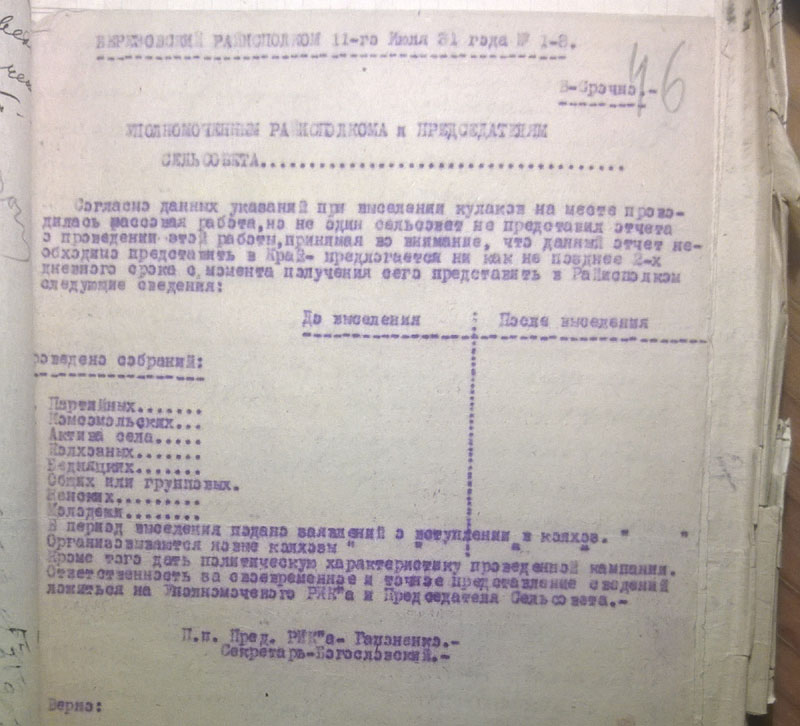 В ЗСК сельсоветы заполняли специальную форму отчетности — список выселенных семей. Почему-то в ВСК это не практиковалось. Эти списки — хорошее подспорье при составлении Книги памяти.
