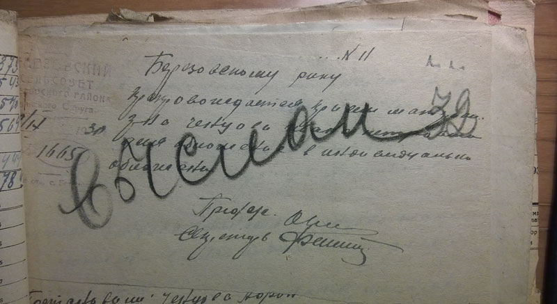Есть еще другие протоколы. По сути то же, только формат другой, решения троек пишутся прямо по левому полю, и окончательное решение не всегда понятно: один карандаш пишет ВЫСЛАТЬ, другой — ВОЗДЕРЖАТЬСЯ. В некоторых районах вместо резолюции писали синим карандашом одну из цифр: I, II, III, то есть категорию.