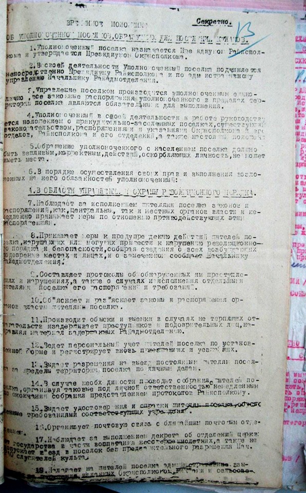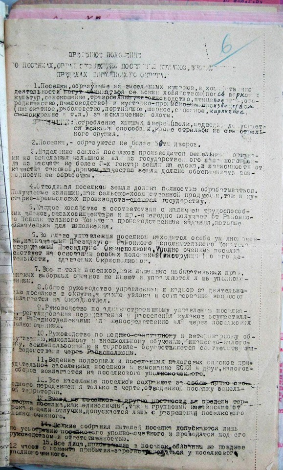 9. Руководство по административному управлению поселками, регулирование передвижения и расселения кулаков осуществляется Райадмотделениями или непосредственно или поселковых уполномоченных.