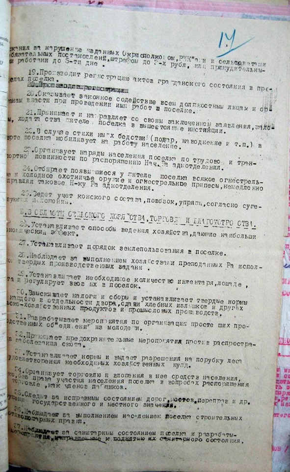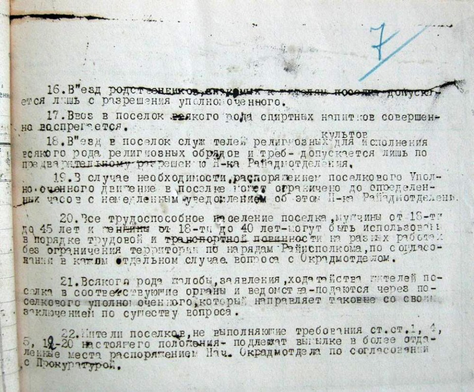 20. Все трудоспособное население поселка, мужчины от 18-ти до 45 лет и женщины от 18-ти до 40 лет могут быть использованы в порядке трудовой и транспортной повинности на разных работах без ограничения территории по нарядам Райисполкома, по согласовании в каждом случае вопроса с Окрадмотделом.