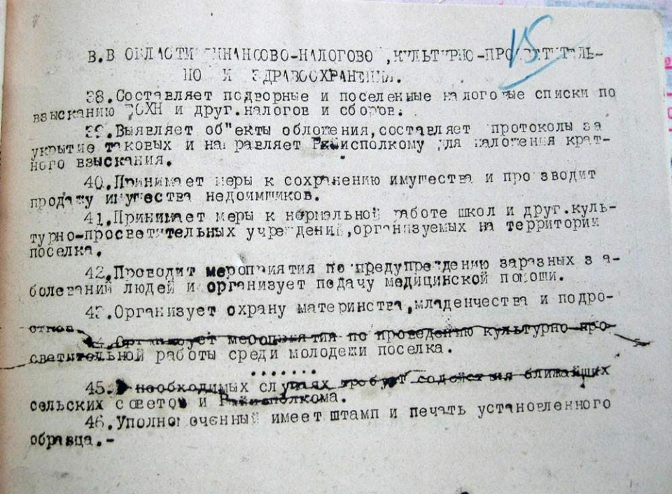 23. Организует наряды населения поселка по трудовой и транспортной повинности по распоряжению Нач. Райадмотделения.