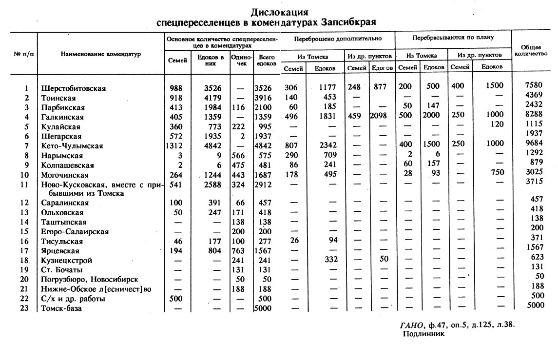 Основной базой временной концентрации спецпереселенцев является Томский лагерь, через который всего прошло 20 000 человек, 15 000 переброшено, оставалось на 16/II с.г. 5000 чел., из них занято на работах 460, в том числе на лесозаготовках 280. Остальные нетрудоспособные (женщины, старики, дети, инвалиды).