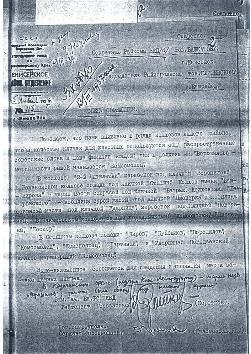 Сообщаем, что нами выявлено в ряде колхозов нашего района, что в качестве кличек для животных используются общераспространенные советские слова и даже фамилии вождей: так в колхозе им.”Ворошилова” – мерин масти рыжей называется “Комсомолец”.