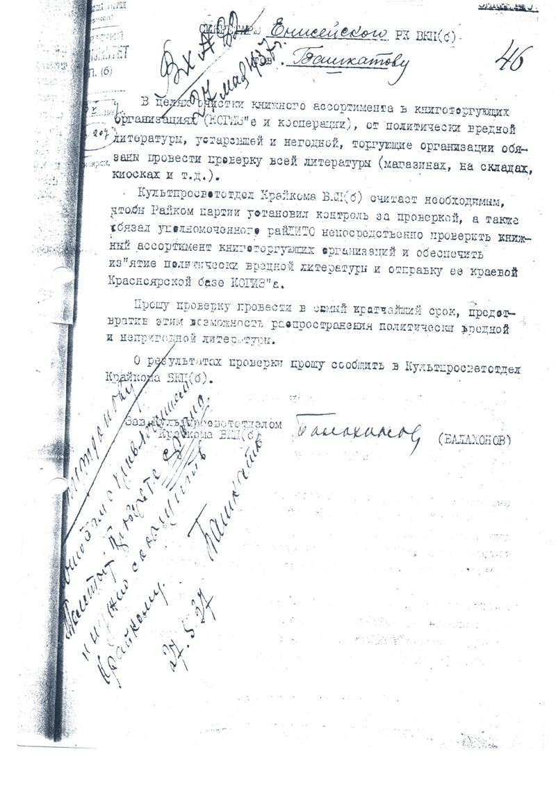 Культпросветотдел Крайкома ВКП(б) считает необходимым, чтобы Райком партии установил контроль за проверкой, а также обязал уполномоченного райЛИТО непосредственно проверить книжный ассортимент книготоргующих организаций и обеспечить из"ятие политически вредной литературы и отправку её краевой Красноярской базе КОГИЗ"а.