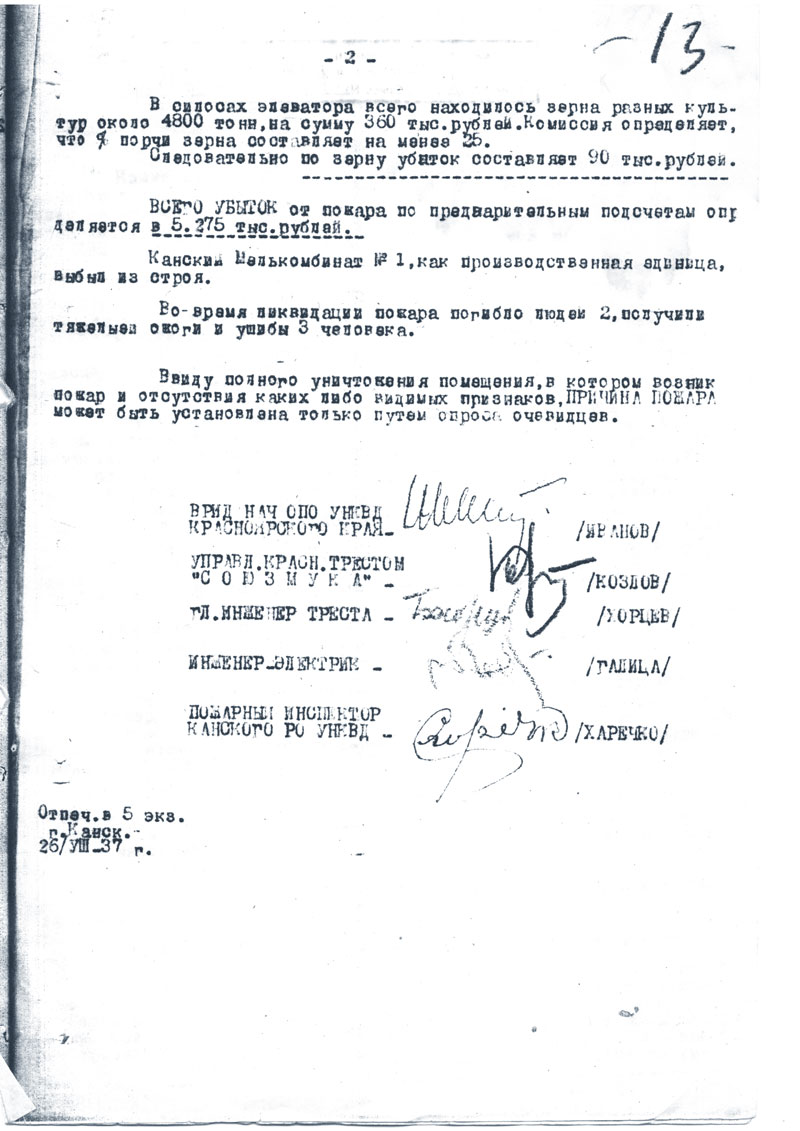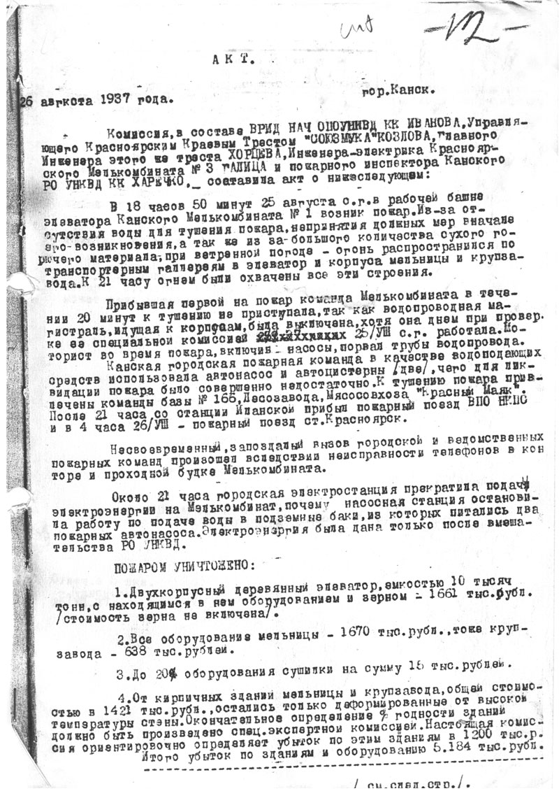Комиссия в составе ВРИД НАЧ ОПО УНКВД КК ИВАНОВА, Управляющего Красноярском Краевым Трестом "СОЮЗМУКА" КОЗЛОВА, Главного Инженера этого же треста ХОРЦЕВА, Инженера-электрика Красноярского Мелькомбината N 3 ГАЛИЦА и пожарного инспектора Канского РО УНКВД КК ХАРЕЧКО, составила акт о нижеследующем: