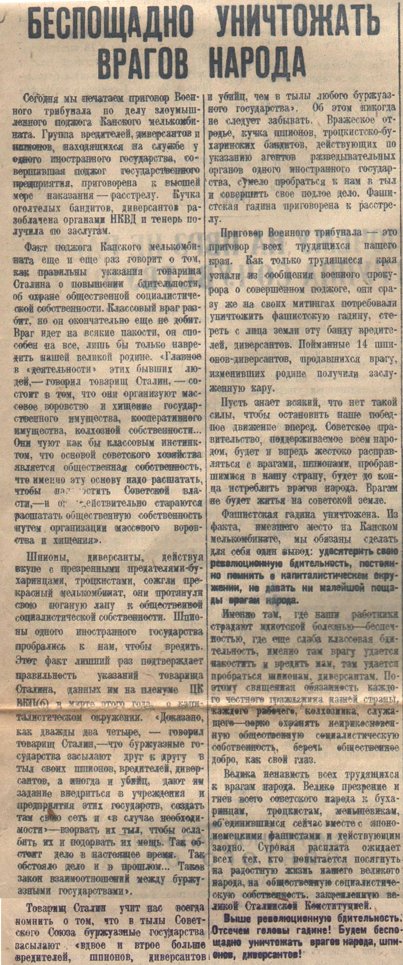 Сегодня мы печатаем приговор Военного трибунала по делу злоумышленного поджога Канского мелькомбината. Группа вредителей, диверсантов и шпионов, находящихся на службе у одного иностранного государства, совершившая поджог государственного предприятия, приговорена к высшей мере наказания - расстрелу. Кучка оголтелых бандитов, диверсантов разоблачена органами НКВД и теперь получила по заслугам.