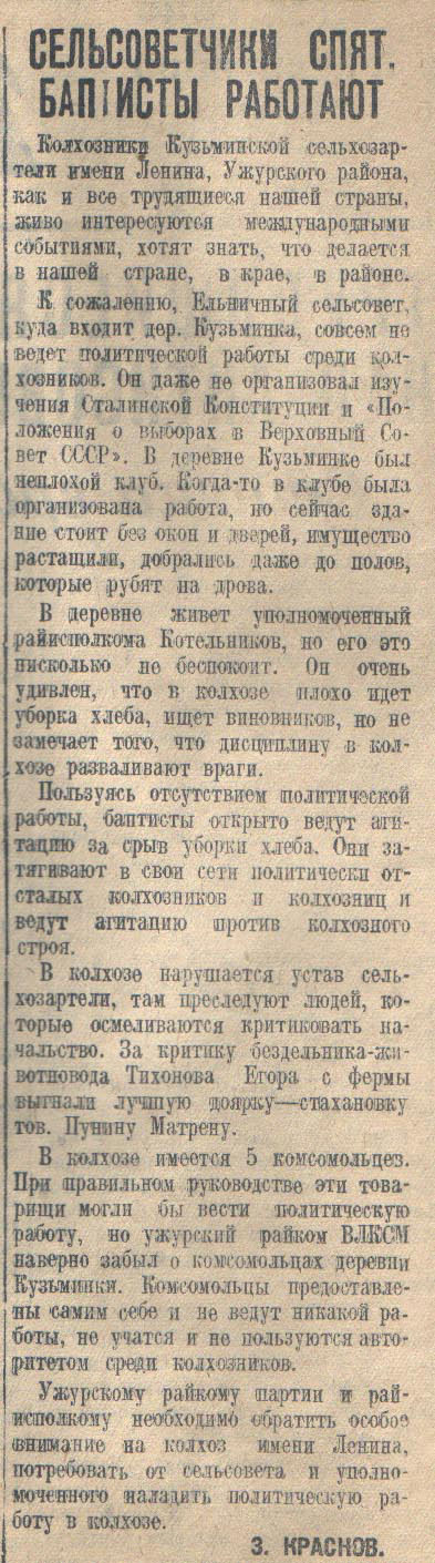 Пользуясь отсутствием политической работы, баптисты открыто ведут агитацию за срыв уборки хлеба. Они затягивают в свои сети политически отсталых колхозников и колхозниц и ведут агитацию против колхозного строя.