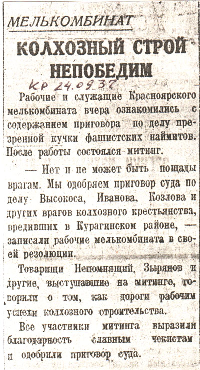- Нет и не может быть пощады врагам. Мы одобряем приговор суда по делу Высокоса, Иванова, Козлова и других врагов колхозного крестьянства, вредивших в Курагинском районе, - записали рабочие мелькомбината в своей резолюции.