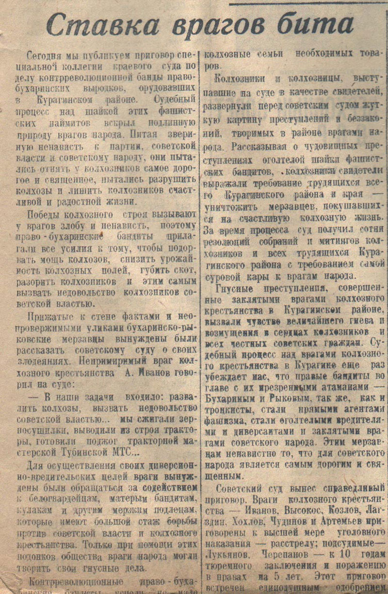 Гнусные преступления, совершенные заклятыми врагами колхозного крестьянства в Курагинском районе, вызвали чувство величайшего гнева и возмущения в сердцах колхозников и всех честных советских граждан. Судебный процесс над врагами колхозного крестьянства в Курагино еще раз убеждает нас, что правые бандиты во главе с их презренными атаманами - Бухариным и Рыковым, так же, как и троцкисты, стали прямыми агентами фашизма, стали оголтелыми вредителями и диверсантами и заклятыми врагами советского народа. Этим мерзавцам ненавистно то, что для советского народа является самым дорогим и священным.
