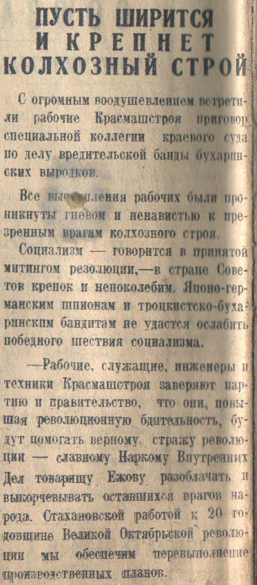 - Рабочие, служащие, инженеры и техники Красмашстроя заверяют партию и правительство, что они, повышая революционную, бдительность, будут помогать верному стражу революции - славному Наркому Внутренних Дел товарищу Ежову разоблачать и выкорчевывать оставшихся врагов народа. Стахановской работой к 20 годовщине Великой Октябрьской революции мы обеспечим перевыполнение производственных планов.