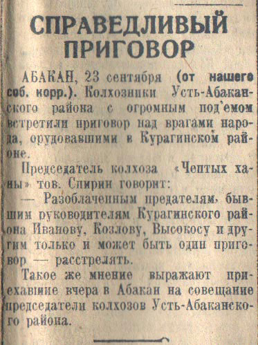 Советский суд вынес справедливый приговор. Враги колхозного крестьянства - Иванов, Высокос, Козлов, Лагздин, Хохлов, Чудинов и Артемьев приговорены к высшей мере уголовного наказания - расстрелу; подсудимые - Лукьянов, Черепанов - к 10 годам тюремного заключения и поражению в правах на 5 лет. Этот приговор встречен единодушным одобрением всех трудящихся нашего крaя. Врагов народа, цепных псов фашизма нужно уничтожить без всякого сожаления.