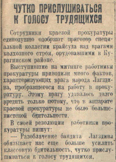 Вредители грубо попирали революционную законность. Всячески защищая отъявленных бандитов, белогвардейцев, кулаков и других врагов колхозного крестьянства, они привлекали к ответственности ни в чем неповинных людей. Руки этих мерзавцев обагрены кровью лучшего председателя колхоза Андрея Кувина и пионера Алеши Маноенко. Враг народа Лагздин, будучи районным прокурором, охотно удовлетворял просьбы кулаков и не обращал никакого внимания на законные жалобы трудящихся. С благословения этого бухаринского мерзавца, враги народа избивали и всячески преследовали честных колхозников, ликвидировали колхозы, лишали колхозные семьи необходимых товаров.