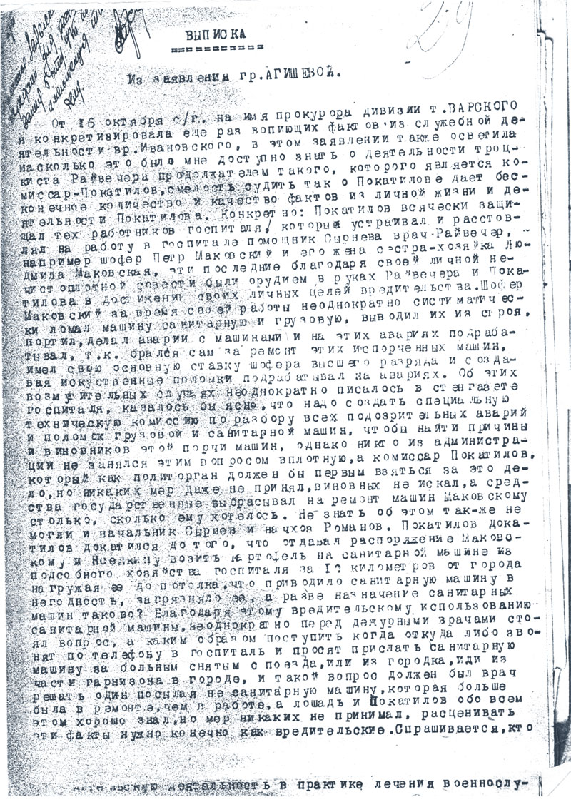 От 16 октября с/г на имя прокурора дивизии т.Варского я конкретизировала еще раз о вопиющих фактах из служебной деятельности вр.Ивановского. В этом заявлении также осветила, насколько это было мне доступно знать, о деятельности троцкиста Райвечер и продолжателем которого является комиссар Покатилов. Смелость судить так о Покатилове дает бесконечное количество фактов из личной жизни и деятельности Покатилова. Конкретно: Покатилов всячески защищал тех работников госпиталя, которых устраивал и расставлял на работу в госпитале помощник Сырнева врач Райвечер, например шофер Петр Маковский и его жена сестра-хозяйка Людмила Маковская. Эти последние благодаря своей личной нечистоплотной совести были орудием в руках Райвечера и Покатилова в достижении своих личных целей вредительства.