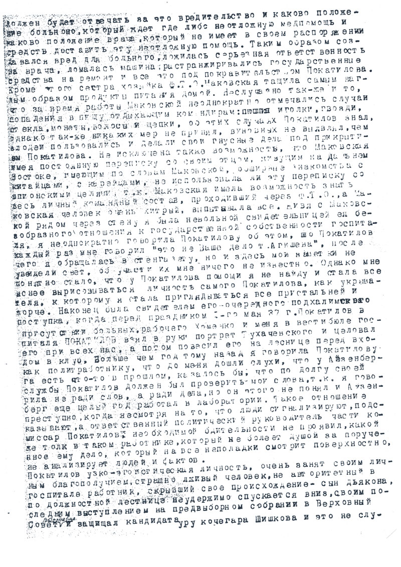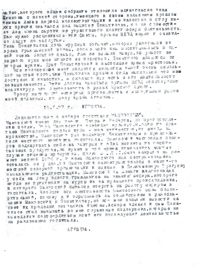 Не исключена также возможность, что Маковская, имея постоянную переписку со своим отцом, живущим на Дальнем Востоке, имеющим, по словам Маковской, обширные знакомства с китайцами и корейцами, не использовала эту переписку со шпионскими целями. Т.к. Маковская имела возможность знать весь личный командный состав, проходивший через Ф.Т.О., а Маковская человек очень хитрый, выпытывала все. Живя с Маковской рядом через стену, я была невольной свидетельницей ее безобразного отношения к государственной собственности госпиталя. Я неоднократно говорила Покатилову об этом, но Покатилов каждый раз мне говорил: «Это не Ваше дело, т.Агишева». После чего я обращалась в стенгазету, но и здесь мои наметки не увидели свет, об участи их мне ничего не известно. Однако мне понятно стало, что у Покатилова помощи я не найду и стала все яснее вырисовываться личность самого Покатилова, как укрывателя, к которому я стала приглядываться все пристальней и зорче.