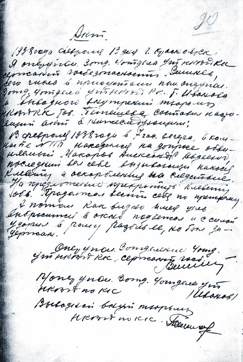 Я, оперуполномоченный 3 отд. 4 отдела УТ(?) НКВД КК сержант госбезопасности Вишнев, сего числа в присутствии пом. оперупол. 3 отд. 4 отдела УТ НКВД КК Г.Иванова и выводного внутренней тюрьмы НКВД КК тов.Петешева составил настоящий акт о нижеследующем: