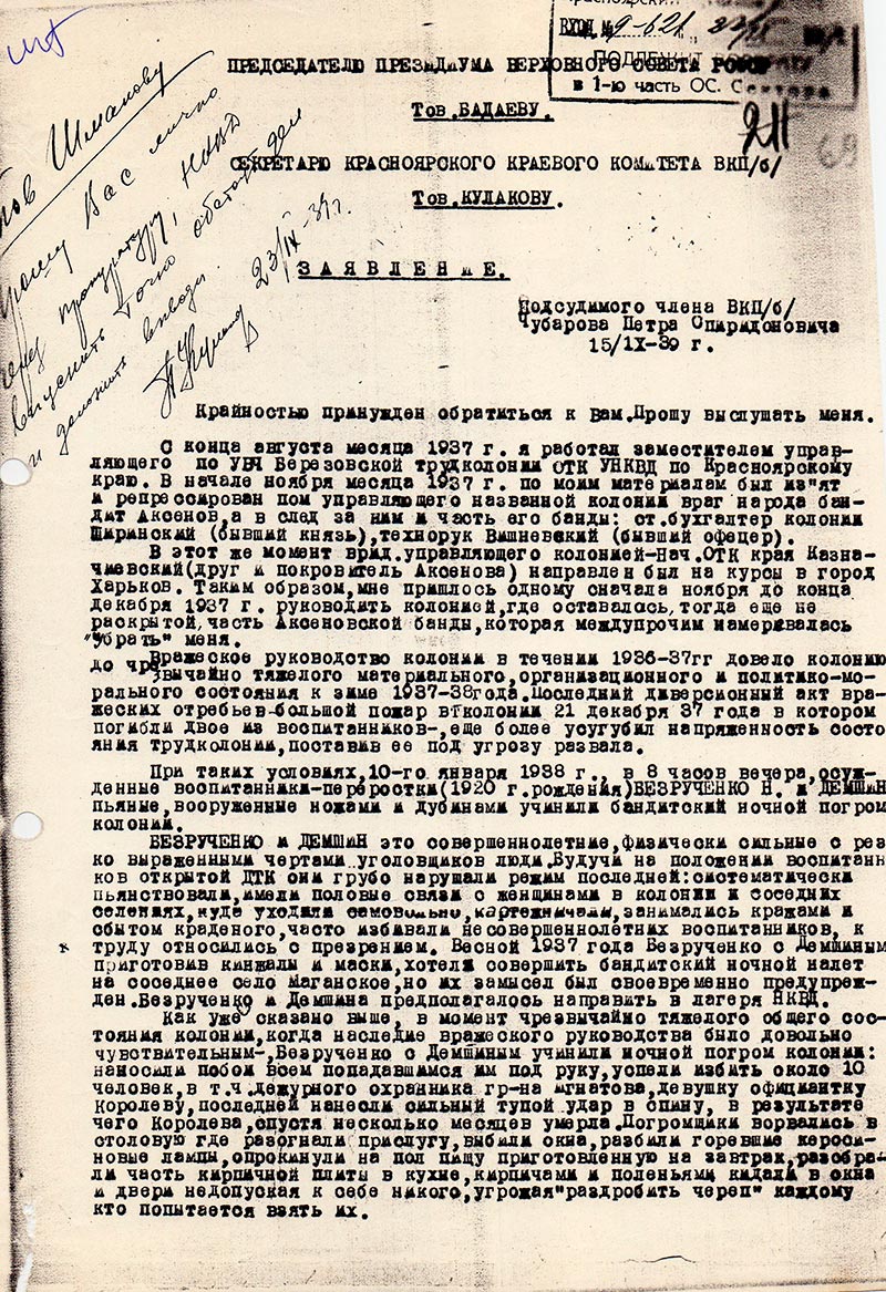 Тов. КУЛАКОВ, я хочу Вам со всей откровенностью и честностью, описать, почему я дошел до положения арестанта и нахожусь в настоящее время в Красноярской тюрьме. В органах ЧК, ОГПУ_НКВД – я проработал с 1919 года по день ареста. Член ВКП(б) с 1920 года, последняя работа – н-к Ужурского РО УНКВД.