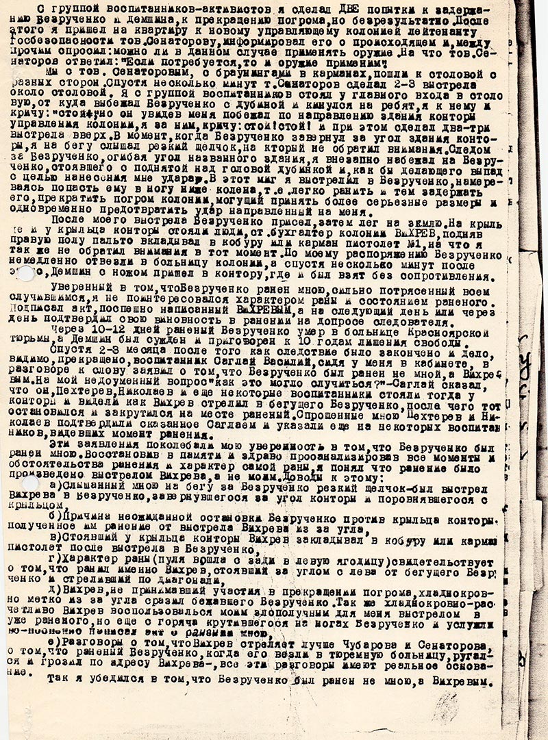 Считая, что обвиняемый “признался” – ожидают приезда Военной Коллегии и для того, чтобы эти вымышленные показания части обвиняемых были-бы подтверждены и нашло-бы свое отражение “ в правильности работы следователей” Блинов и Стрельник поехали в Новосибирск “учится” как лучше перед Военной коллегией провести дела. Получивши там видимо значительный опыт и приехав в Красноярск, получили не отрадную картину т.е. большинство правых “разложились” т.е. стали отказываться от показаний подписанных ими и составленные следователями, тогда в УНКВД – начинается так называемый “ВОССТАНОВИТЕЛЬНЫЙ ПЕРИОД” из переферии вызывают сотрудников УГБ, Ясюка, кожевникова, Кузнецова из Абакана Станько и другие, которые вновь начинают “обрабатывать” этих правых, применяют обратно те-же действия и последним физически истощается – вынужденно подписывает протокол, после этого последняя обработка в той-же форме происходила и перед Военной Коллегией, но тут под диктовку правого заставляют собственно-ручно писать заявление в адрес Военной Коллегии, что он признает себя виновным и чтобы дать ему снисхождение и на суде с ним долго не разговаривают. Спрашивают “признаете себя виновным” – он отвечает – нет – и пытается сообщить Военной Коллегии, что он вынужденно дал показание, на это суд не обращает внимание, а руководствуется наличием документов в деле и приговаривает к ВМР.