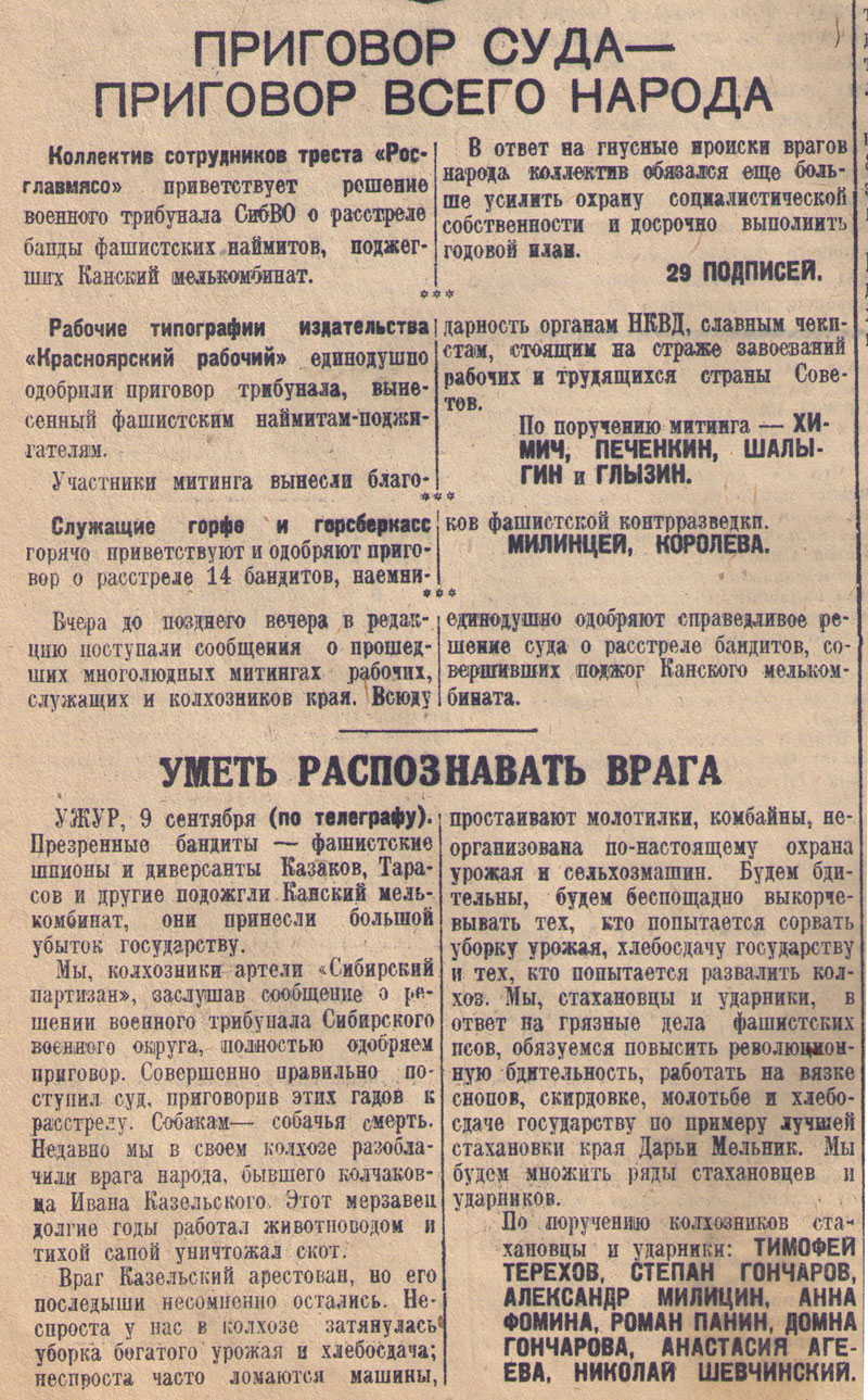 Приговор суда - приговор народа. Уметь распознавать врага (статьи в "Красноярском рабочем 12 сентября 1937 г.)