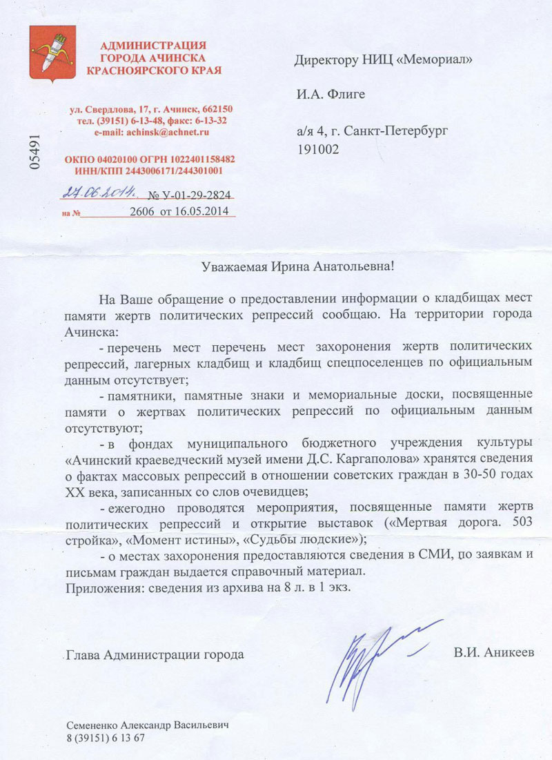 Сообщаем Вам, что 26 июля 1990 года комиссия по социалистической законности депутатов Ачинского горсовета рассматривала вопрос о фактах массовых репрессий В отношении советских граждан в 30 -50-х годах, совершенных сталинским режимом.
