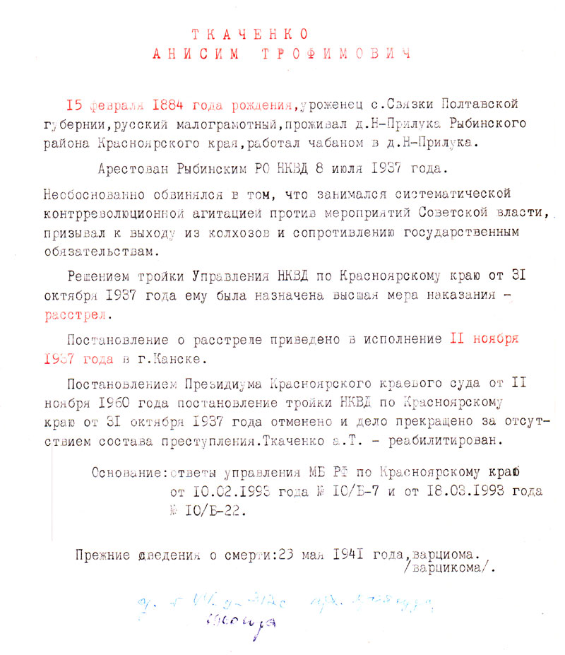 Постановлением Президиума Красноярского краевого суда от 11 ноября 1960 года постановление тройки НКВД по Красноярскому краю от 31 октября 1937 года отменено и дело прекращено за отсутствием состава преступления. Ткаченко А.Т. — реабилитирован.