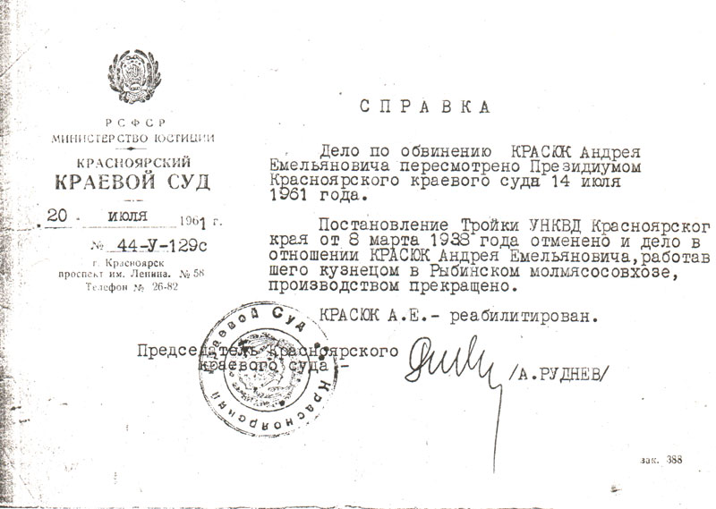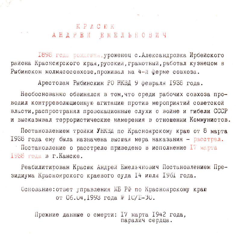 Реабилитирован Красюк Андрей Емельянович Постановлением Президиума Красноярского краевого суда 14 июля 1961 года.