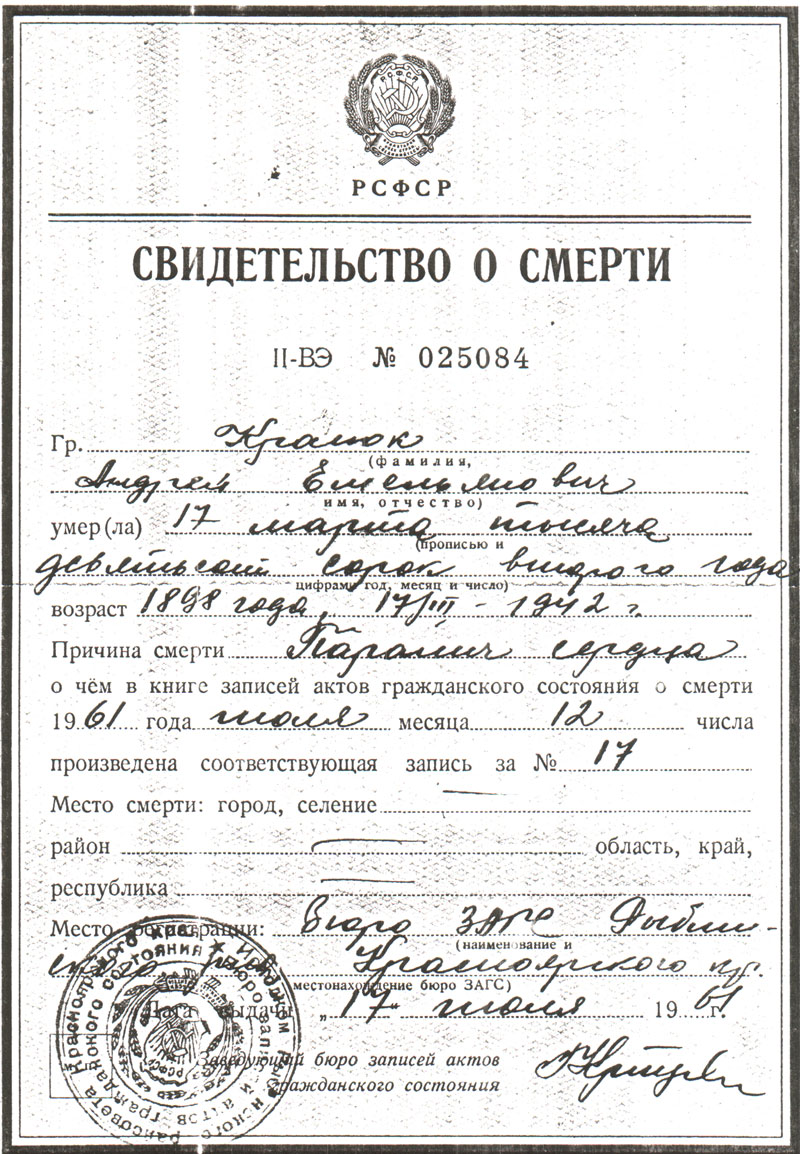 лет, о чем в книге регистрации актов о смерти 1961 года июля месяца 16 числа