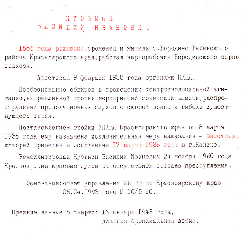 Реабилитирован Кузьмин Василий Иванович 24 ноября 1960 года Красноярским краевым судом за отсутствием состава преступления.