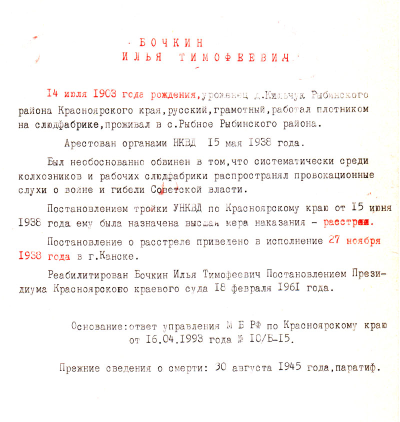 Реабилитирован Бочкин Илья Тимофеевич Постановлением Президиума Красноярского краевого суда 18 февраля 1961 года.