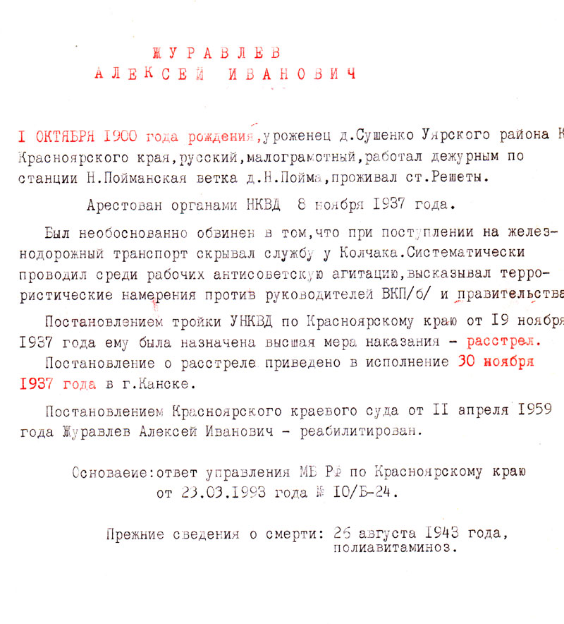 1 октября 1900 года рождения, уроженец д. Сушенко Уярского района Красноярского края, русский, малограмотный, работал дежурным по станции Н. Пойманская ветка д. Н. Пойма, проживал ст. Решеты.