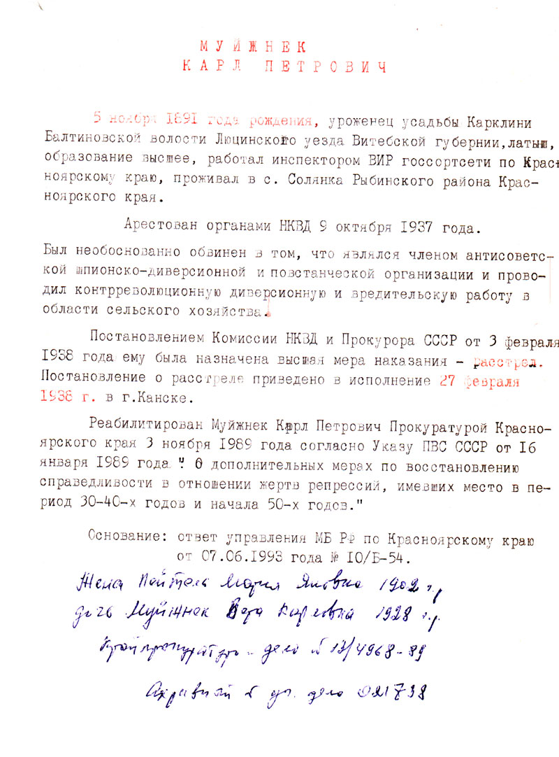 Реабилитирован Муйжнек Карл Петрович Прокуратурой Красноярского края 3 ноября 1989 гола согласно Указу ПВС СССР от 16 января 1989 года “О дополнительных мерах по восстановлению справедливости в отношении жертв репрессий, имевших место в период 30-40 х годов и начала 50-х годов”.