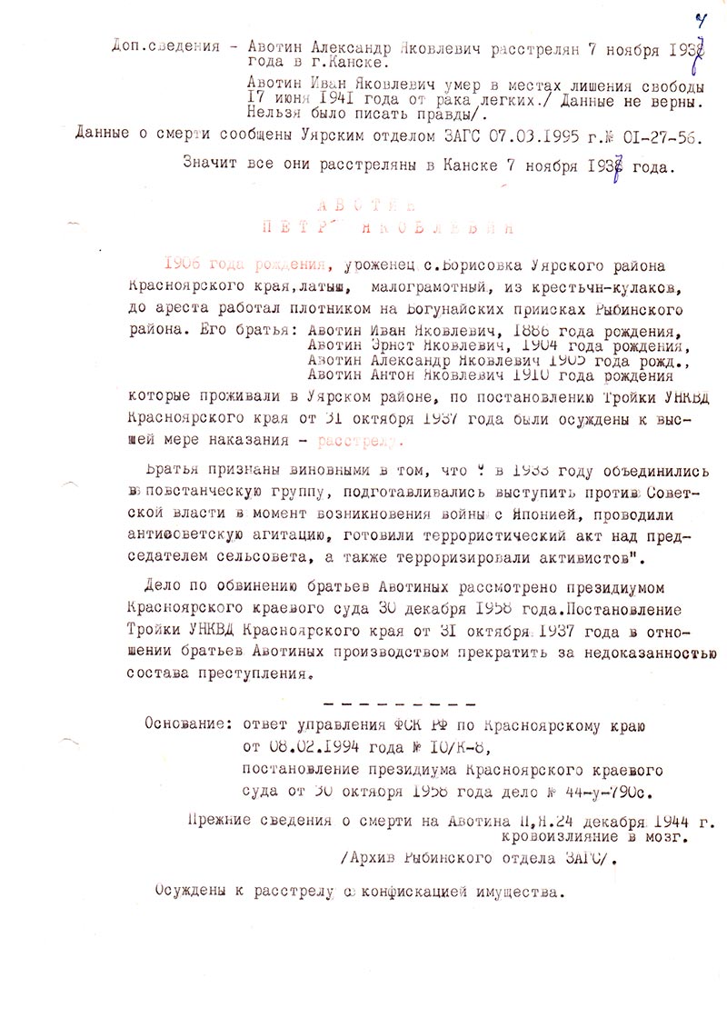 Дело по обвинению братьев Авотиных рассмотрено президиумом Красноярского краевого суда 30 декабря 1958 года. Постановление Тройки УНКВД Красноярского края от 31 октября. 1937 года в отношении братьев Авотиных производством прекратить за недоказанностью состава преступления.