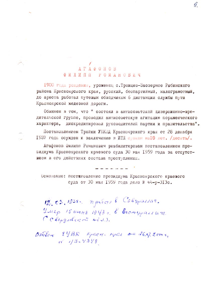 Агафонов Филипп Романович реабилитирован постановлением президиума Красноярского краевого суда 30 мая 1959 года за отсутствием в его действиях состава преступления.
