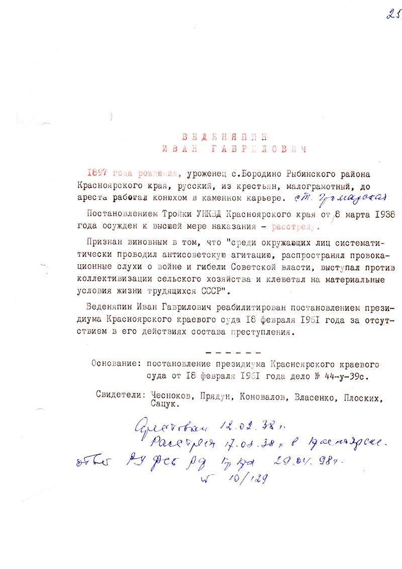 Веденяпин Иван Гаврилович реабилитирован постановлением президиума Красноярского