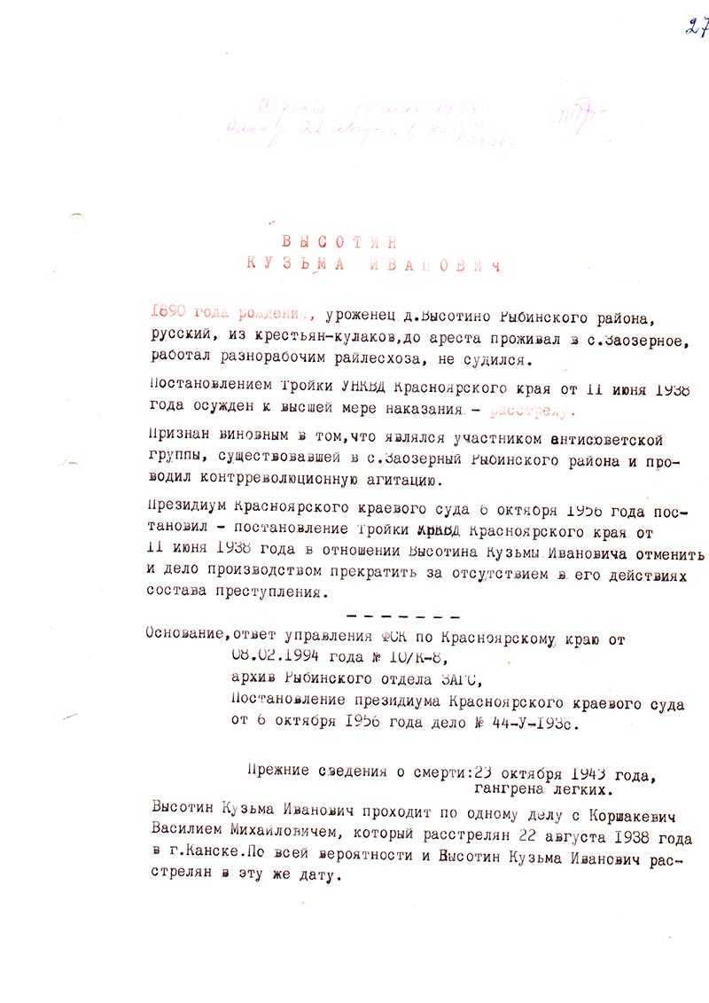 Высотин Кузьма Иванович проходит по одному делу с Коршакевич Василием Михайловичем, который расстрелян 22 августа 1938 года в г. Канске. По всей вероятности и Высотин Кузьма Иванович расстрелян в эту же дату.